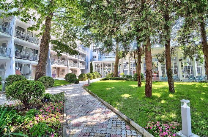 In einem ruhigen und grünen Teil des Ferienortes Albena an der bulgarischen Schwarzmeerküste erfreuen sich Urlauber an einem erholsamen und zugleich abwechslungsreichen Aufenthalt in diesem Hotel. Wer besonders gerne schlemmt, der ist hier besonders gut aufgehoben: Neben Mittag- und Abendessen in Buffetform erwartet die Urlauber ein kontinentales Langschläferfrühstück und ein Mitternachtssnack im hoteleigenen Restaurant Ralitsa. Nach einer erholsamen Nacht können Gäste den praktischen Shuttlebus zum berühmten Goldstrand nehmen. Die Hotelanlage besticht vor allem durch ein sehr modernes Design und seine Familienfreundlichkeit. Während die Erwachsenen ein vielseitiges Sportprogramm genießen, können sich Kinder in gleich 3 Kinderpools und bei der allabendlichen Minidisco austoben.