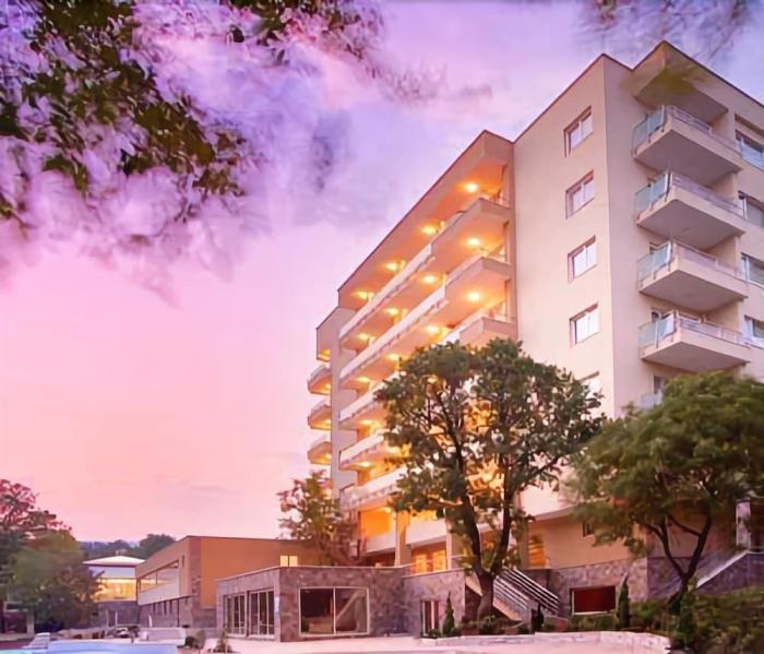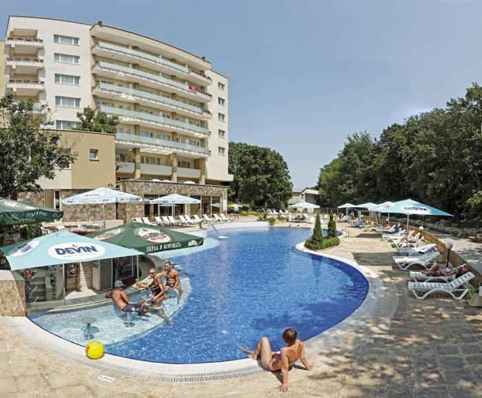 Feine bulgarische Küche und sorglose Stunden im erholsamen Spa- und Wellnesscenter – das gemütliche Hotel weiß zu überzeugen. Unweit vom bildschönen Goldstrand gelegen, erstreckt sich das Resort in einem lauschigen Waldstück, das in einer breiten Palette aus satten Grüntönen erstrahlt. Obendrein werden Naturverliebte vom einzigartigen Innenhofs begeistert sein: Die detailverliebte Lounge in rustikalem Holzdekor inmitten aufstrebender, grünbehangener Balkone ist eine echte Ruheoase. Im komfortablen Außenpool erfrischen sich Gäste im angenehmen temperierten Wasser oder mit einem kühlen Drink an der integrierten Bar. Dazu müssen sie das Becken nicht mal verlassen! Für die nötige Abwechslung sorgen schwungvolle Spiele wie Tischtennis.
