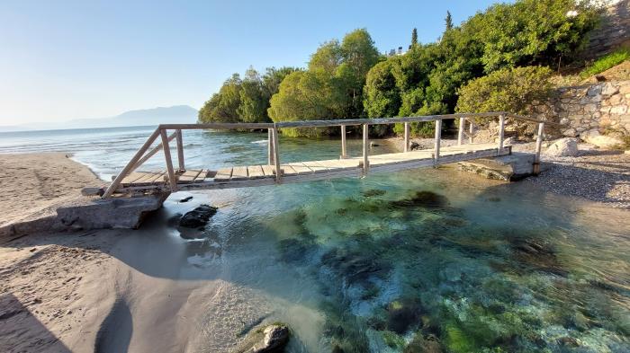 Der Strand ist ca. 15 Minuten entfernt. Der Weg führt entlang am glasklarem Wasser. Es ist ein Sandstrand mit klarem Wasser. Am Ende befindet sich ein Zufluss mit herrlichen kalten Wasser. Liegen und Schirme sind im Vergleich zu anderen Stränden sehr billig. Ca. 10 - 12 €. Wirsind sogar zum Mittagessen ins Hotel gelaufen. Der Strand am Hotel ist ein Kiesstrand. Die Straße ist eine Sackgasse zum nächsten und letzten Hotel und ist daher wenig befahren.