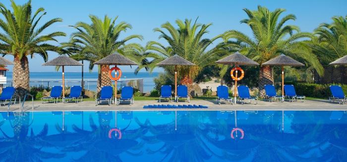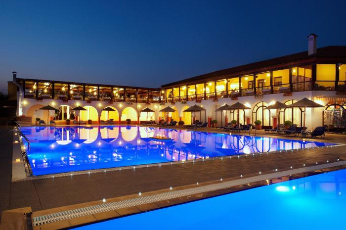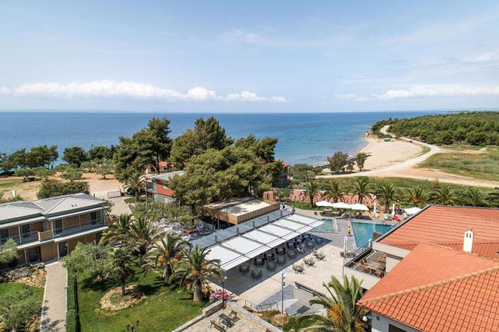 Zwischen leuchtend grünen Bäumen verstecken sich die hellen, typisch griechischen Wohngebäude des schönen Hotels auf der Halbinsel Chalkidiki. Eine große Gartenanlage mit Palmen und farbenprächtigen Blüten umschließt die nah am Meer gelegene Anlage. Zum feinen Sandstrand, der mit dem Umweltsiegel Blaue Flagge ausgezeichnet wurde, gelangen Gäste über einen kurzen Pfad. Familien betonen, dass die Animateure und das Personal sehr kinderfreundlich sind und sich neben speziellen Menü-Wünschen um ein abwechslungsreiches und spannendes Animationsprogramm bemühen. Gleichzeitig erholen sich erwachsene Gäste hervorragend, da auf der ruhigen und weitläufigen Anlage genügend Platz zum Ausruhen am Pool oder der Grünanlage ist. Wer sich gern sportlich verausgabt, wird sich über die Minigolfanlage, den Tennisplatz oder die Morgengymnastik freuen.