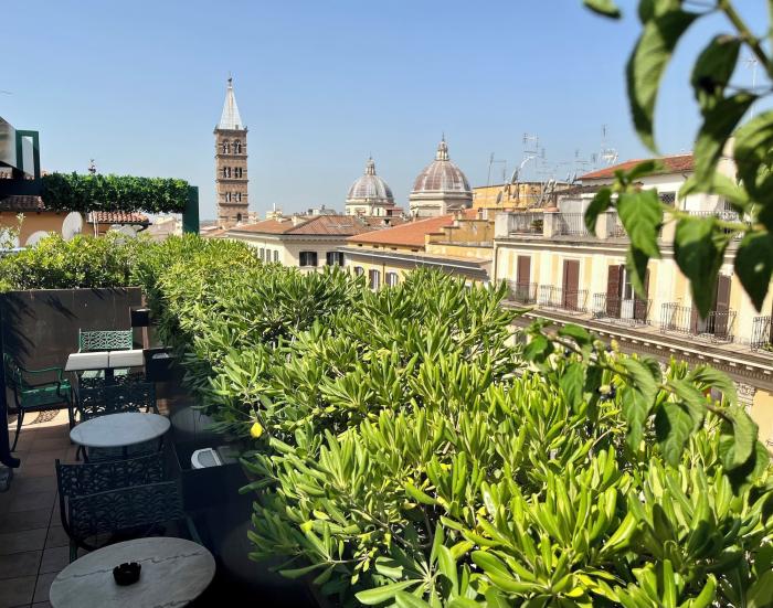 Unser Zimmer hatte keinen Balkon/Terrasse…ob es Zimmer mit Balkon gibt, weiß ich leider nicht… Mit oder ohne Balkon…ich kann das Hotel ruhigen Gewissens empfehlen…toller Frühstückstaum im rooftop mit sehr reichhaltigem Angebot…das habe ich in Rom schon ganz anders erlebt…Zimmer zwar etwas in die Jahre gekommen aber sehr sauber…