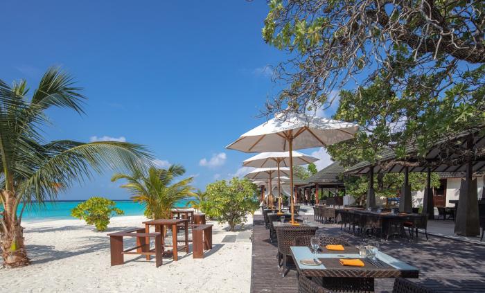 Bereits beim ersten Anblick aus dem Air Taxi eröffnet sich Gästen die Schönheit dieses malerischen Resorts auf den Malediven: Das Hotel begeistert mit Strandvillen, einem tropischen Sandstrand und paradiesischen Tauchbedingungen. Ob zum Tauchen, Schnorcheln, Baden oder Entspannen – Urlauber finden hier, was sie gesucht haben und noch mehr. Das Spa bietet eine Vielzahl wohltuender Behandlungen, während sich Bewegungshungrige beim Wassersport verausgaben oder das umfangreiche Sportangebot der Anlage nutzen. Die stilvoll ausgestatteten Wasservillen und Suiten bieten Komfort, die 2 Buffetrestaurants stillen kulinarische Gelüste.