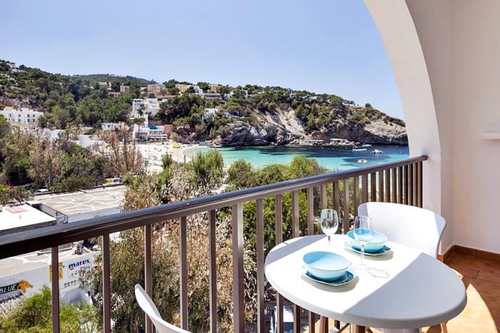 Ein schöner Blick von der Terrasse über die Bucht von Portinatx. Großer Wohnraum des Appartements. Der Pool ist hübsch.