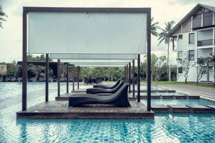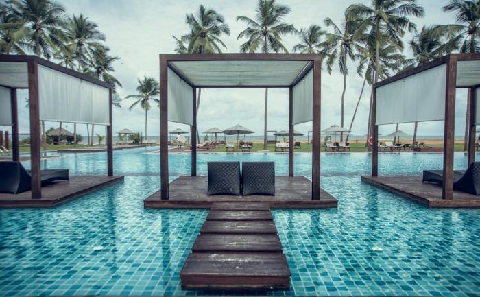 An der traumhaften Westküste Sri Lankas empfängt die Anlage Gäste in einem tropischen Palmenhain umgeben von zwei Flussläufen des Ging Oya. Die Urlauber wohnen hier entweder in einem der 3 flachen Hauptgebäude oder in 5 idyllischen Wasserbungalows. Direkt nebenan wartet der ruhige Sandstrand, der sich ideal zum Sonnen und für gute Schwimmer zugleich zum Baden eignet. Wem die Wellen des Indischen Ozeans zu stark sein sollten, der findet im großen Swimmingpool im Herzen der Anlage Abkühlung. Rings um den Pool wie auch im Garten können sich die Urlauber in Schatten spendenden Pavillons mit Tüllgardinen erholen. Die ausgezeichnete Küche serviert abwechslungsreiche und überaus geschmackvolle Speisen aus Sri Lanka und aller Welt.