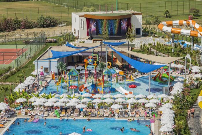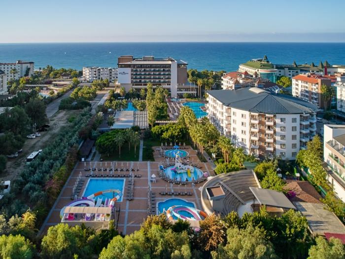 Im beliebten türkischen Ferienort Side bei Antalya befindet sich dieses erstklassige, familienfreundliche Resort. Neben einem hoteleigenen Privatstrand bietet die weitläufige Anlage ihren Gästen einen Wasserpark mit mehreren Rutschen sowie einen Fitnessraum und Tennisplätze für sportlich Aktive an. Für Ruhe und Entspannung sorgt hingegen ein Besuch des Wellnessbereichs. Kulturinteressierte und Hobbyhistoriker zieht es während des Urlaubs zu den nahegelegenen Ruinen des antiken Sides. Neben einem Amphitheater, das einst bis zu 20.000 Zuschauer fassen konnte, befinden sich dort auch die Überreste einer einst gewaltigen Stadtmauer und eines Aquädukts. Dank des kostenlosen WLANs im Hotelzimmer können die Gäste ihre Urlaubseindrücke unmittelbar mit den Daheimgebliebenen teilen.
