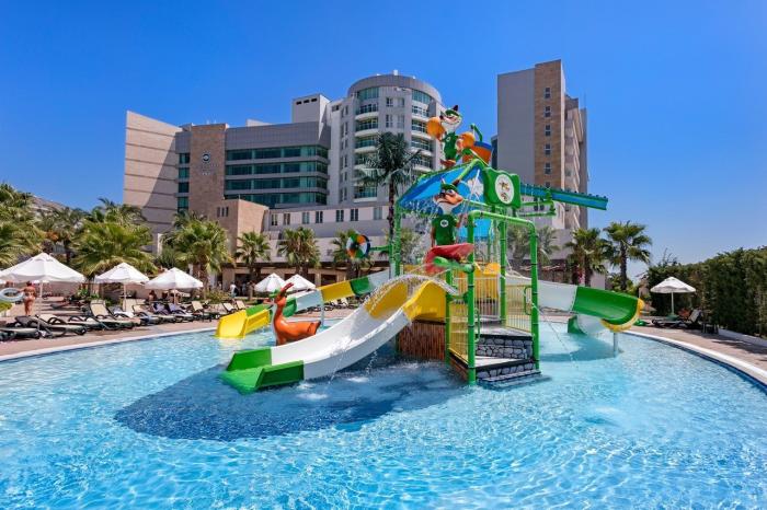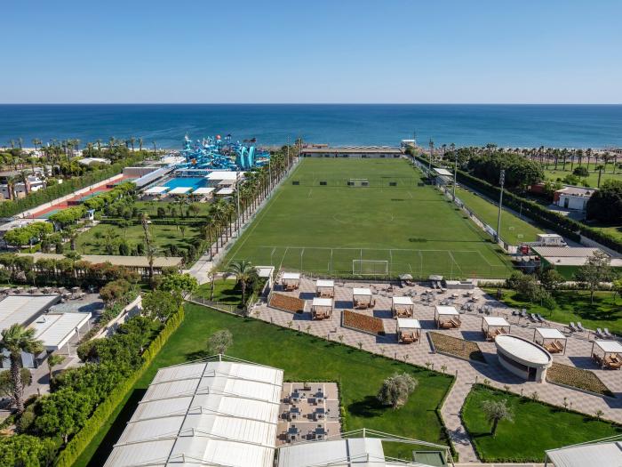 Vor der Kulisse des Taurusgebirges erleben Urlauber in diesem vielseitigen Hotel in Lara einen traumhaften Urlaub an der türkischen Mittelmeerküste. Die großzügige Anlage verspricht jede Menge Abwechslung zwischen zahlreichen Pools, einem Vergnügungspark und dem beliebten Miniclub. Während Aktivurlauber ihre Bahnen im Semi-Olympischen Sportbecken ziehen, stürzen sich Abenteurer in die Fluten des aktiven Wellenbeckens. Erholung verspricht ein Besuch im edlen Spa-Bereich. In 6 verschiedenen A-la-carte-Restaurants schlemmen sich Gäste durch Speisekarten aus aller Welt. Bei einer Reise durch die traditionelle türkische Küche passieren Feinschmecker pikante mexikanische Spezialitäten bis hin zu fernöstlichen Gerichten im passenden Ambiente und vergessen dabei schnell Ort und Zeit.