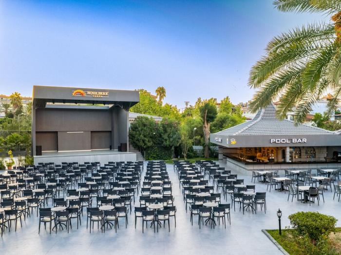 Dieses luxuriöse Hotel liegt an der Türkischen Riviera im beliebten Ferienort Evrenseki. Der Sandstrand befindet sich nur 300 Meter entfernt, die historische Altstadt von Side mit ihren verschiedenen Einkaufs- und Unterhaltungsmöglichkeiten erreichen Türkei-Urlauber nach 7 Kilometern. Im Außenbereich des gemütlichen Hotels lädt ein großer Pool zur Erfrischung ein. Die von mediterranen Pflanzen und Palmen gesäumte Sonnenterrasse bietet Liegestühle und Sonnenschirme. Für die kleinen Gäste steht außerdem ein separates Kinderbecken zur Verfügung. Ruhe und Entspannung finden Gäste des Hauses im Spa-Bereich – ob beim Schwitzen in der Sauna oder bei einer wohltuenden Massagebehandlung.