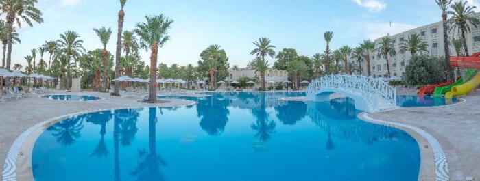 Ein orientalischer Traum erwartet Reisende unter tunesischer Sonne: Der Komplex aus verschiedenen Gebäudeteilen liegt idyllisch am malerischen Sandstrand von Sousse und erlaubt einen atemberaubenden Ausblick auf das glänzende Mittelmeer, welches Urlauber mit zahlreichen Erkundungsmöglichkeiten zu sich lockt. Obwohl die moderne Hotelanlage viele Sportmöglichkeiten zum Auspowern anbietet, lädt vor allem die von stattlichen Palmen gesäumte Poollandschaft zum Verweilen ein. Die kleinen Gäste der Anlage können sich hier auf den farbenfrohen Rutschen austoben oder auf dem Kinderspielplatz spannende Abenteuer erleben. Nachdem der anspruchsvolle Gaumen mit regionalen und internationalen Köstlichkeiten verwöhnt wurde, klingt der Tag mit einem fruchtigen Cocktail bei unterhaltenden Shows gemütlich aus.